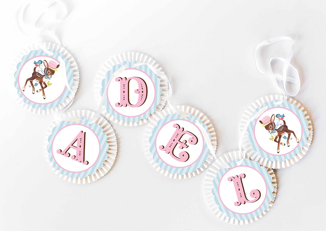 This beautiful rosette banner is perfect for a little girl's party or bedroom decor. It includes thick-cardstock scalloped medallions adhered to luxurious large rosettes. The standard banner reads "HOORAY" with a fawn image on either side, or customize it with whatever word(s) or name(s) you choose. Each letter measures approximately 6.5" and the banner comes with 8' or more of ribbon.