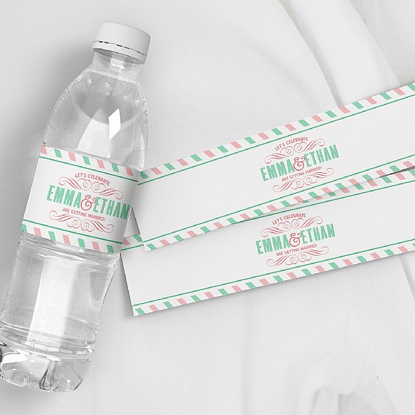 Set of 20 water bottle labels. A client favorite, all Loralee Lewis bottle labels are made to fit most water bottles. Each label measures 8.5" x 2. 5".