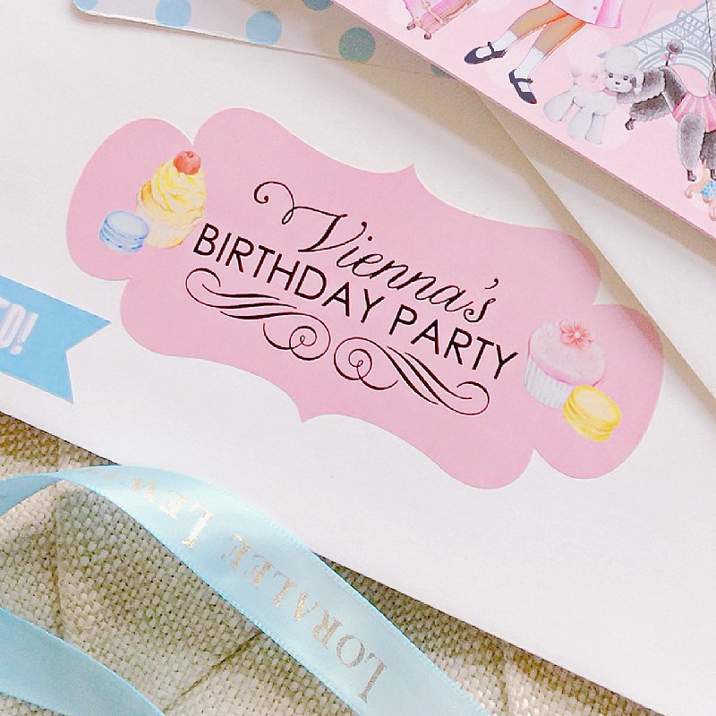 The stickers read, "_______'s BIRTHDAY PARTY".