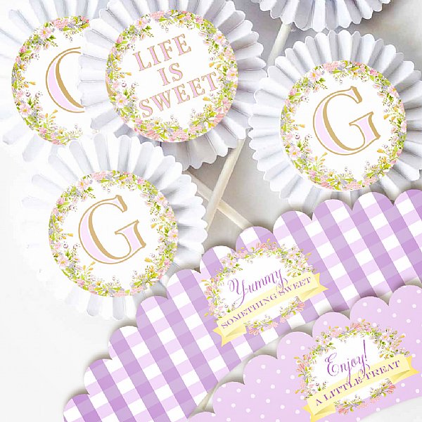 Set of 12 cupcake rosette toppers and 12 cupcake wrappers. Loraleeâ€Ã¢â€žÂ¢s cupcake kit will take your dessert to the next level! Each cupcake wrapper measures 2 3/4"w x 1 3/8"h and fit around standard cupcakes. Each cupcake topper measures 2.25" around approximately.