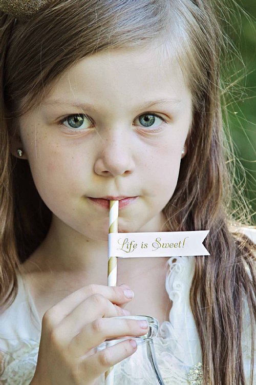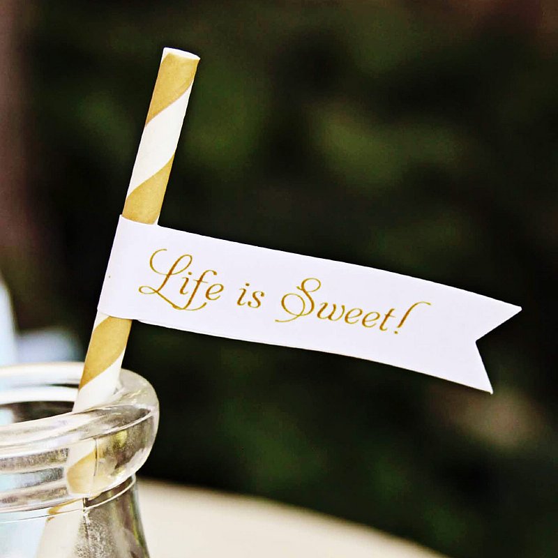 15 straws and pennants are included in a package. You will be sippin' pretty with Loralee's whimsical striped straw and printed pennants! Paper straws measure approximately 8" and straw pennants measure approximately 2 1/2" when adhered. Standard version pennants read "Life is Sweet". Pennants can also be personalized with any name or wording of your choice!