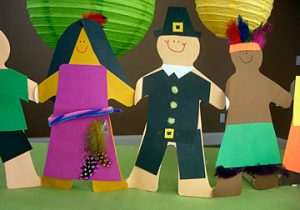 Start by gathering the following supplies: markers or crayons, scissors, construction paper, shapes cut out of the construction paper for children too small to use scissors, feathers, clothespins, glue sticks and Roylco Paper Doll Pad. Roylco’s Paper Doll Pad has multiple shades of paper dolls already cut out and ready for you to dress in Thanksgiving apparel!