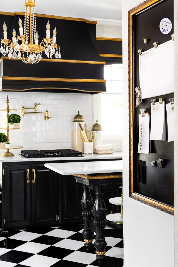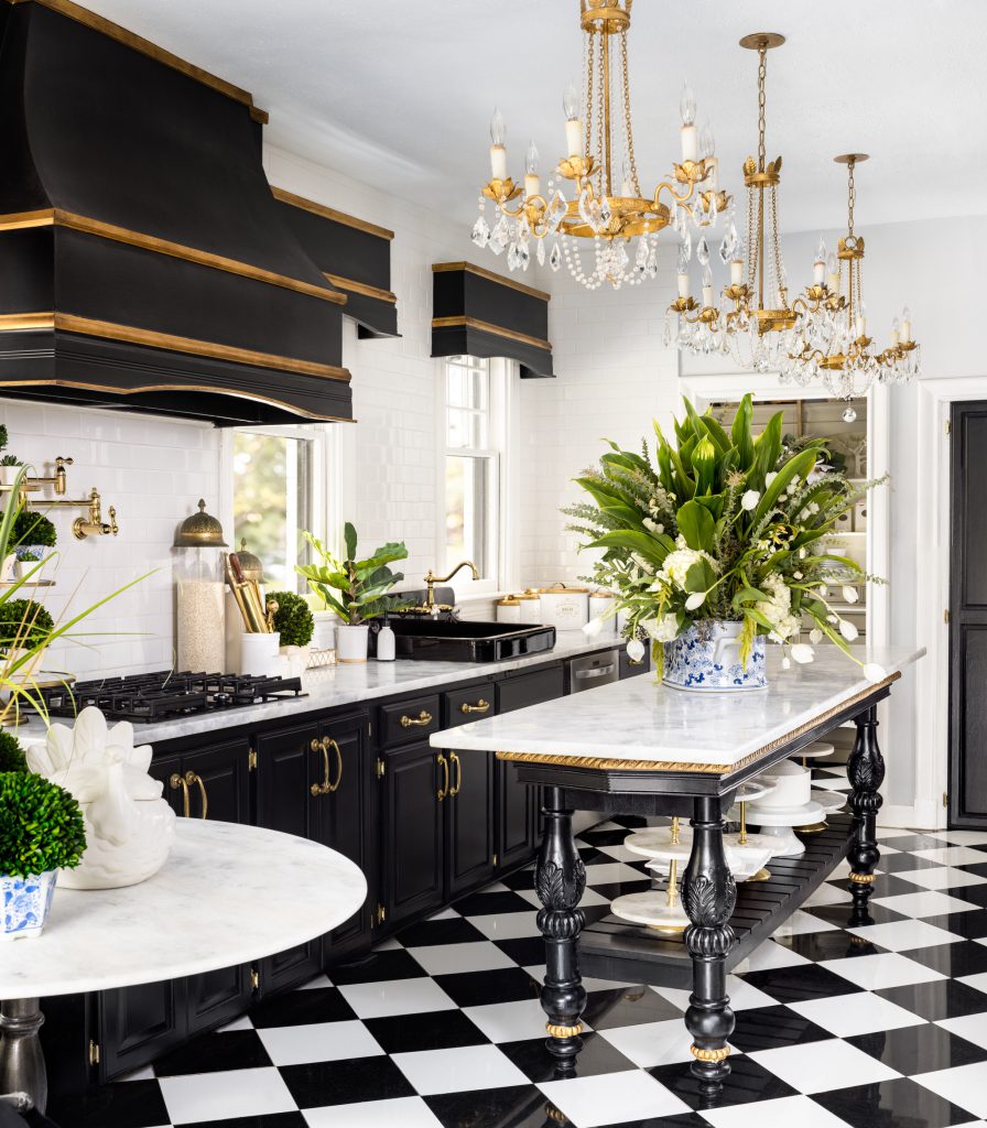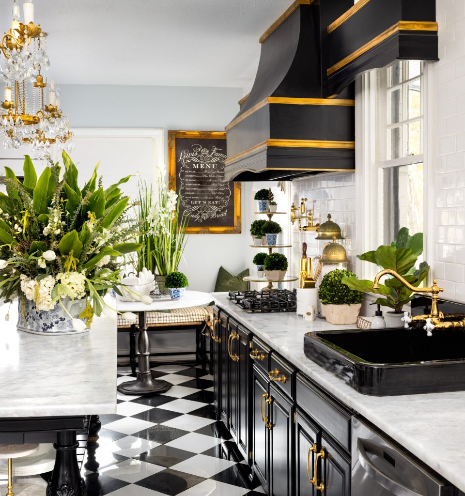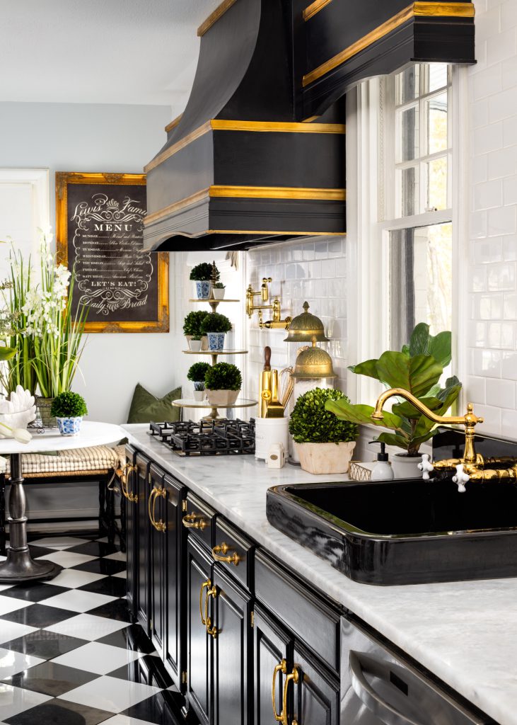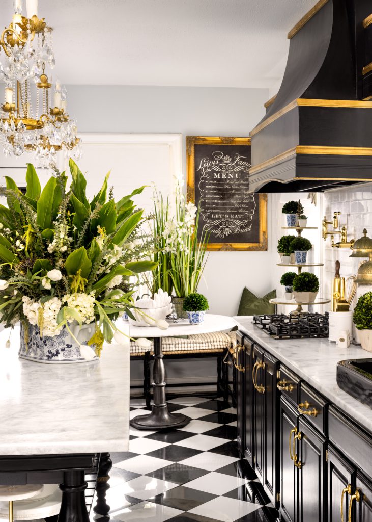 When I first purchased this home, the kitchen had to be tackled. It was truly a mess at the time. I subcontracted the whole thing myself. I don’t know what I was thinking. It truly was a project and almost killed me, but it was a great learning experience – and apparently I haven’t learned my lesson because I am wanting to redo it this year. But let’s talk about what’s here. I wanted a high contrast kitchen instead of the typical all white kitchen you see. So I gutted the kitchen completely and added custom black and white tile. One thing, I felt that I did special here was the kitchen island. It is actually an old dining table of mine. I had a carpenter cut it in half, rework it, give it a paint job, and then add marble to create it. I had the same marble added to the countertops to create a seamless look throughout the whole of the kitchen. I also had the same carpenter create the custom window covers to coordinate with the oven hood. I have two black farmhouse sinks with brass hardware that I adore. I was skeptical about how black sinks would work with a large family, but I took the risk and I have had them now for almost 8 years and they have held beautifully. And I think they make all the difference. The beautiful florals you see in the kitchen here are by Dr. Delphinium. They do a beautiful job. I gift myself for Christmas a monthly floral subscription and it’s my favorite gift.