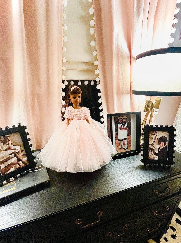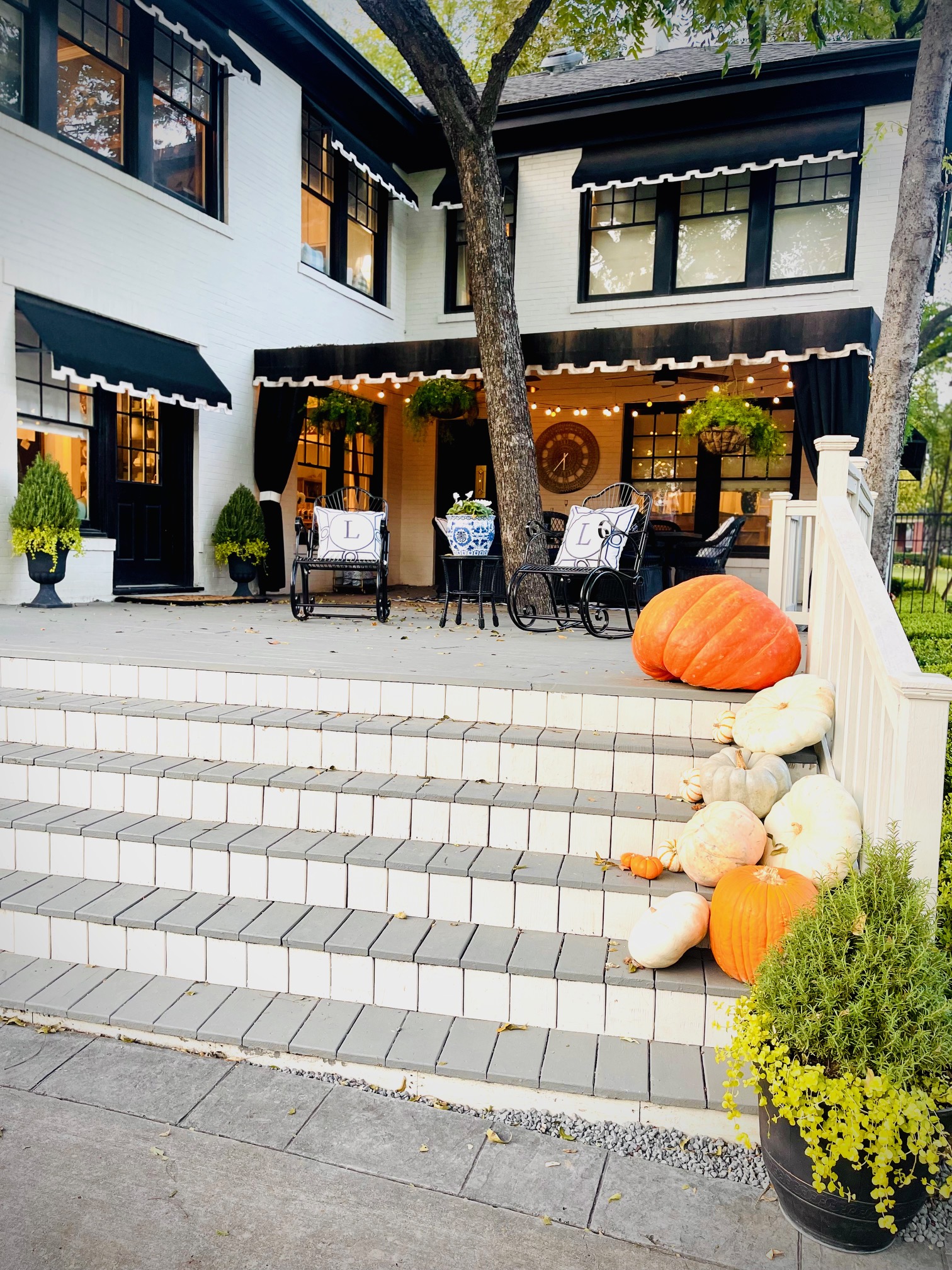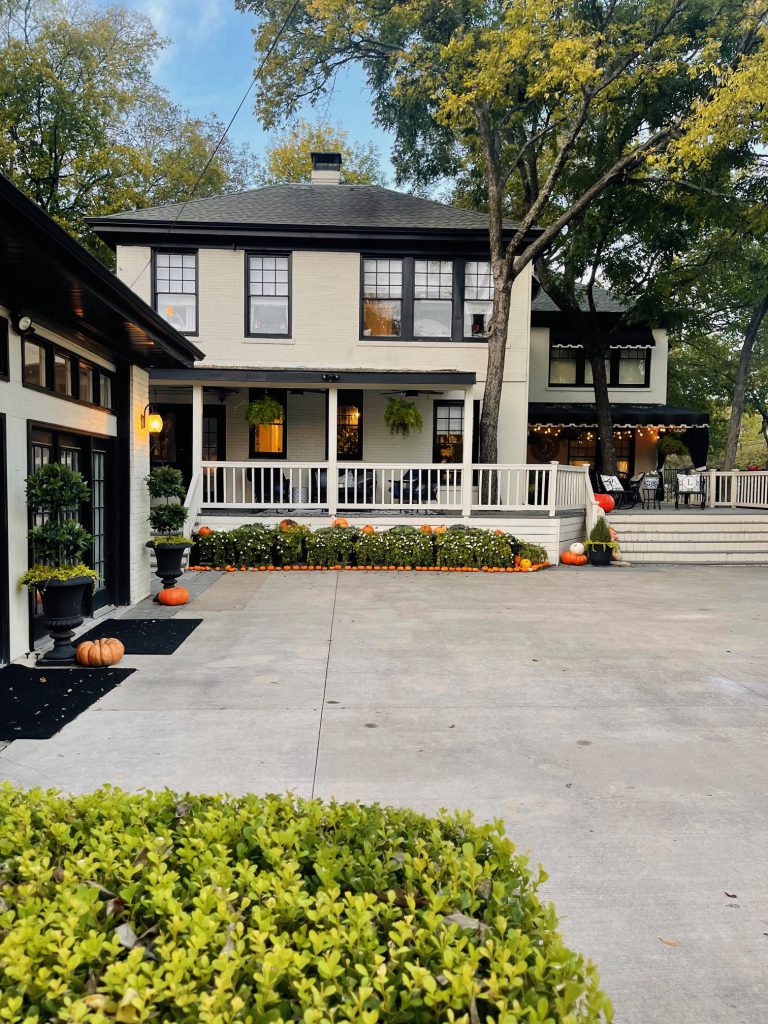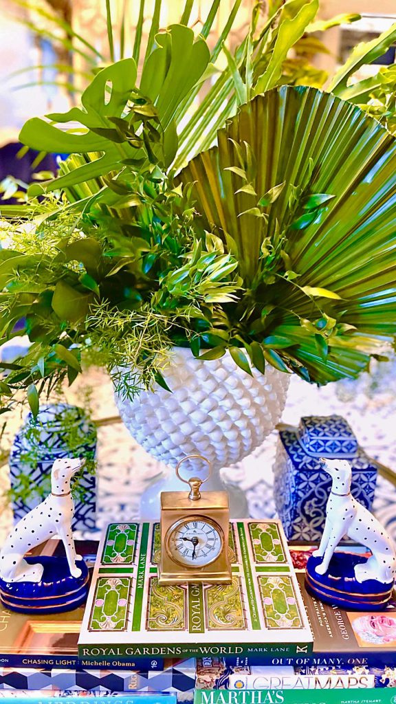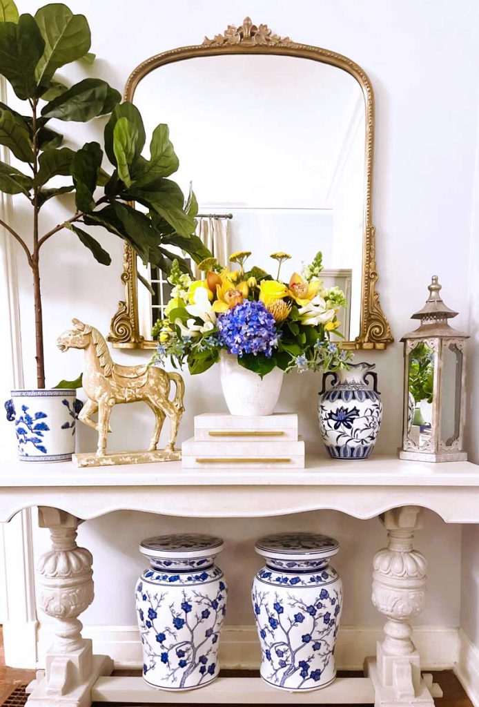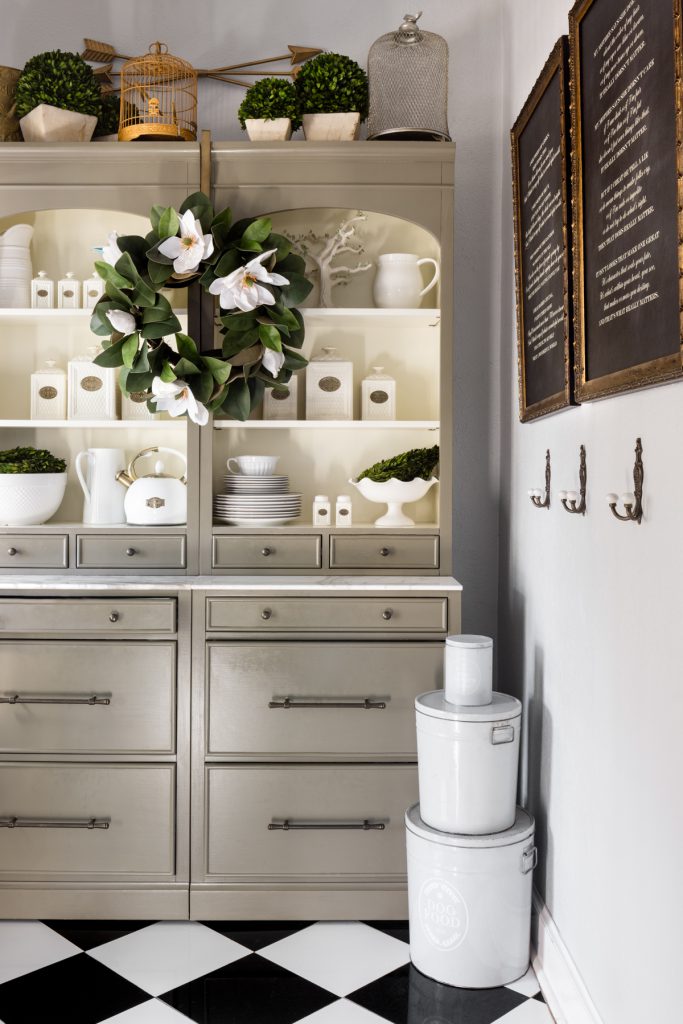 When I first purchased this home, the kitchen had to be tackled. It was truly a mess at the time. I subcontracted the whole thing myself. I don’t know what I was thinking. It truly was a project and almost killed me, but it was a great learning experience – and apparently I haven’t learned my lesson because I am wanting to redo it this year. But let’s talk about what’s here. I wanted a high contrast kitchen instead of the typical all white kitchen you see. So I gutted the kitchen completely and added custom black and white tile. One thing, I felt that I did special here was the kitchen island. It is actually an old dining table of mine. I had a carpenter cut it in half, rework it, give it a paint job, and then add marble to create it. I had the same marble added to the countertops to create a seamless look throughout the whole of the kitchen. I also had the same carpenter create the custom window covers to coordinate with the oven hood. I have two black farmhouse sinks with brass hardware that I adore. I was skeptical about how black sinks would work with a large family, but I took the risk and I have had them now for almost 8 years and they have held beautifully. And I think they make all the difference. The beautiful florals you see in the kitchen here are by Dr. Delphinium. They do a beautiful job. I gift myself for Christmas a monthly floral subscription and it’s my favorite gift.