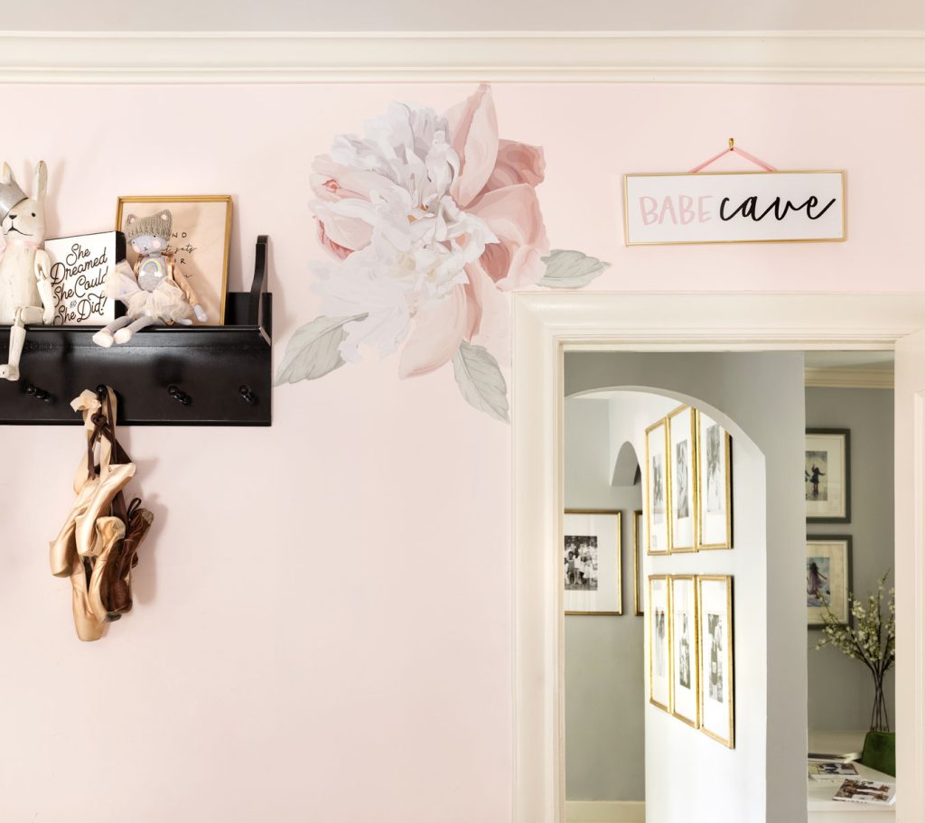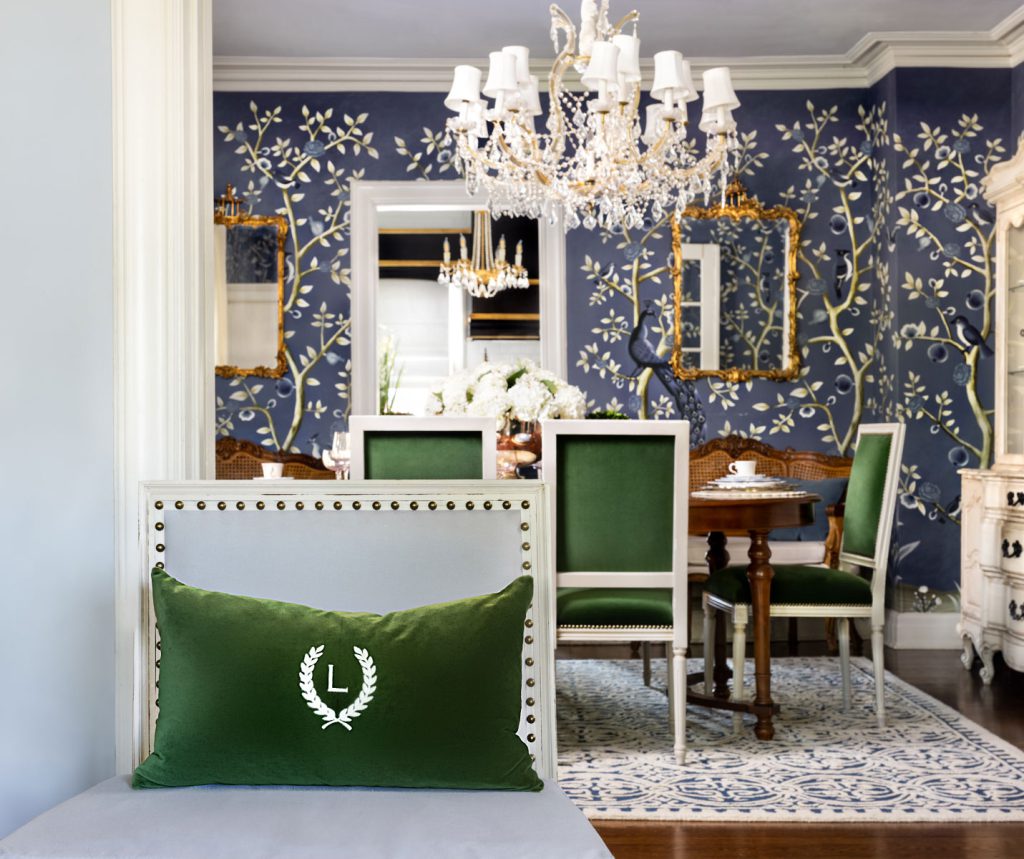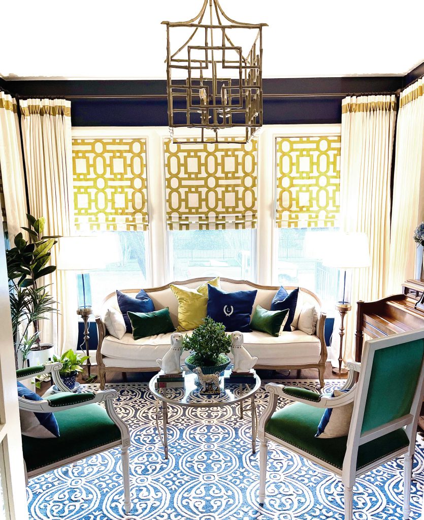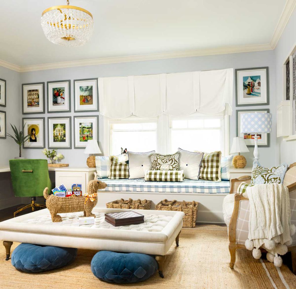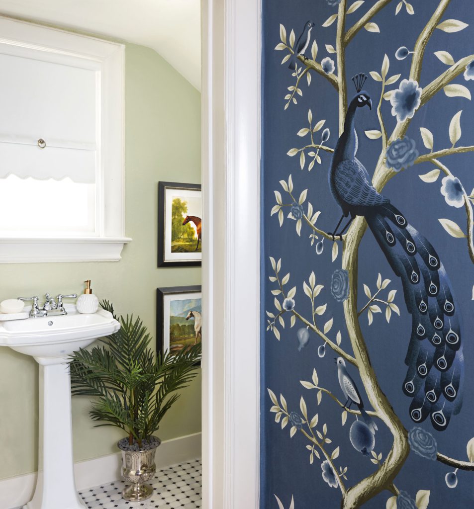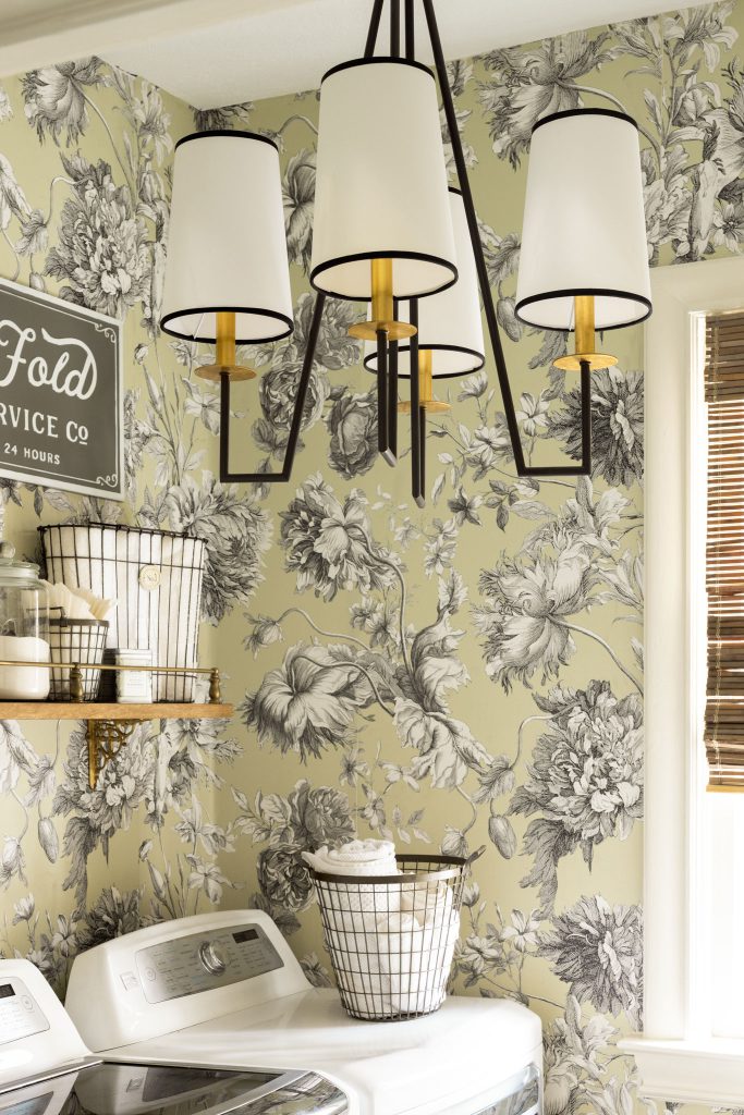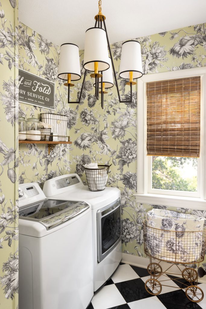 My laundry room is as small as a thimble—so you’d think wallpaper would be the last thing it needed. But I designed this bold floral print (and the coordinating laundry bag!), and now this tiny corner has become my cozy “nook and fold.” The pattern, woven shade, and checkered floor make it feel warm, happy, and like a little secret room just for me. You can find this design on the website here.