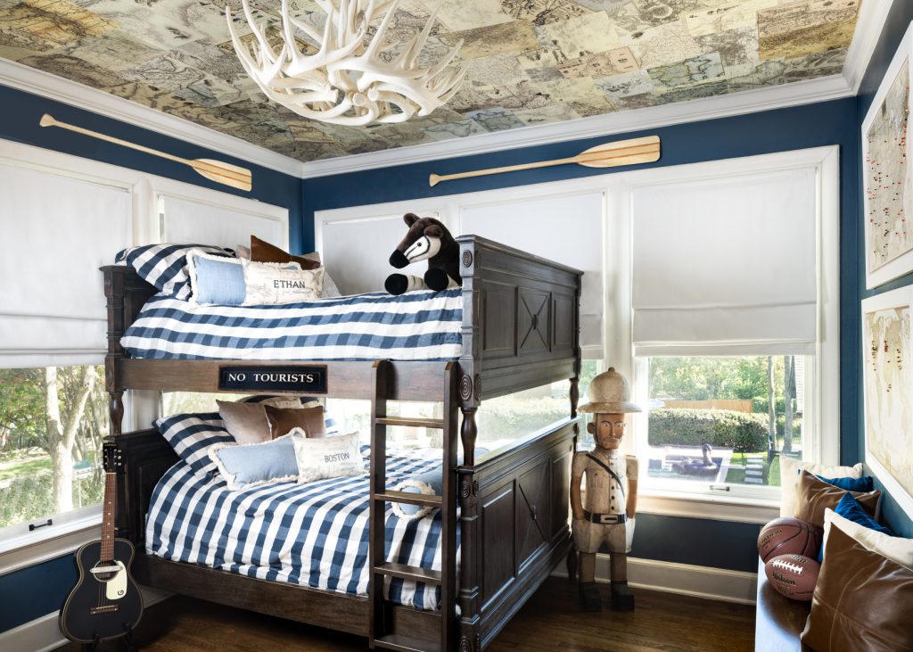 My boys room. I’ve made changes since, since my oldest has moved out, but my favorite thing about this room is their ceiling. I took dozens of vintage maps and wallpapered them onto the ceiling. It’s unique and fun. We travel a lot as a family for fun both internationally and domestically, so on the side of the room is a world map and a map of the states with pins for them to mark everywhere we have visited together.