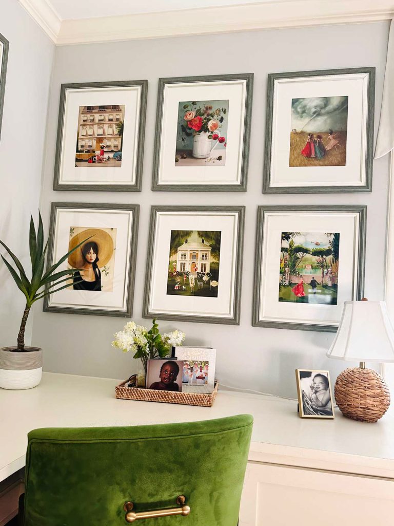 The smallness of this half bath under my staircase in my foyer to me makes it enchanting. It’s a little Harry Potter-esque! I gutted it put little porcelain black and white 1920 mosaic tiles in it, because…well, we had to. I also added this sink because there was a situation with the one that was there before! 🙂 The joys of having four teens! I wish you could see more inside the bathroom, but it is painted in the most fabulous Farrow and Ball green that took me forever to find the right shade. And this photo doesn’t do it justice. And inside, is just a ton of framed horse paintings by George Stubbs on all sides of the tiny tiny bathroom along with horse crops mounted.