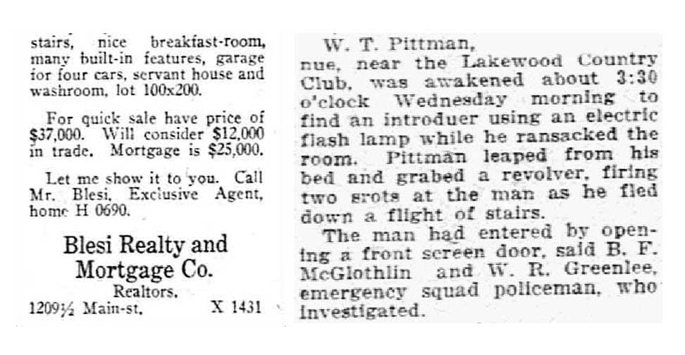 With the help of a local historian, Paula Bosse at Flashback: Dallas, I have been able to collect vintage newspaper clippings about my home. There are adorable snippets about the house, everything from a 1923 burglary that ended with a shooting inside the home, to the original owner being congratulated! Each sweet article is a treasured artifact. Below are just a few of the clippings I have collected. You can also see in the old clippings below where the home’s original mortgage was 25,000 dollars and later relisted in 1924 at a quick resale for a whopping 37,000 dollars – touting it’s all white brick and black trim – and servant quarters in the back.