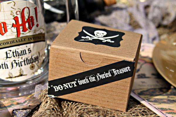 2) As you probably know from my other parties, I am huge fan of pre-prepared servings at children’s parties. For Ethan’s lunch I served his favorite, Peanut Butter and Honey sandwiches in prepackaged white bags with a label. Along with Root Beer with personalized labels, potato chips with little stickers on them saying “Ye Ole Salted Taters” and a mini treasure box of tiny donuts with a little tag that said ” ‘Do-nut’ eat the buried treasure.” Having a place setting for each child made lunch simple – which I love.