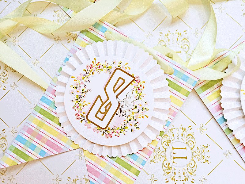 The standard banner reads "EASTER" or you may personalize it with a name or word of your choice!  Each letter is printed on a 3.33" circle adhered to a 4.5" thick rosette and then layered on top of a 5x7 pennant for a beautiful luxurious look. Satin ribbon is included.